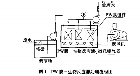 PW—W膜生物反應器將膜組件安裝在生物反應器中,底部安裝有微孔曝氣器,通過曝氣裝置出來的氣液混合流作為折向過濾流程來實現過濾和清洗膜表面,其處理流程可用圖1表示。
