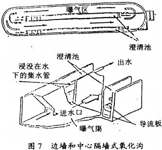 2 豎向循環式,如圖8所示,由一矩形曝氣池、水平隔板和設置在氧化溝兩側的固液分離器組成;旌弦涸谟伤礁舭宸殖傻纳舷露䦟娱g循環流動,從分離器底部的長孔中進入分離器,發離的汛泥通過回流返回氧化溝,出水由分離器上部排出。