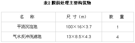 由于膜處理對進水要求較高,膜前處理主要是對源水進行預處理,達到膜進水的要求。主要構筑物如表2所示。