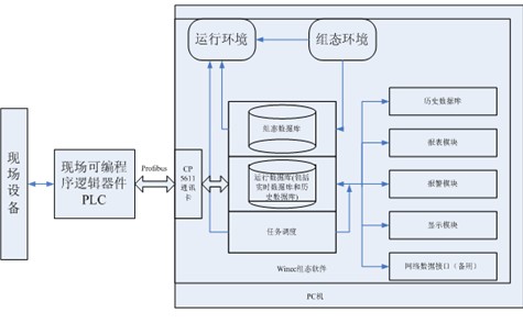 系統(tǒng)配置了操作員站和工程師站,操作員站的上位機(jī)采用研華科技的610H工控機(jī),監(jiān)控系統(tǒng)使用西門子WINCC監(jiān)控組態(tài)軟件,它不僅能很好的支持S7系列的CPU,還集成了多種網(wǎng)絡(luò)連接方式,使上位機(jī)與自動(dòng)化系統(tǒng)的連接工作非常方便。而且它提供了適用于工業(yè)的圖形顯示、消息報(bào)警、過(guò)程值歸檔以及報(bào)表打印等模塊,具有高性能的過(guò)程耦合、快速的畫面更新、以及可靠的數(shù)據(jù)管理功能。圖4所示為WINCC組態(tài)示意圖。