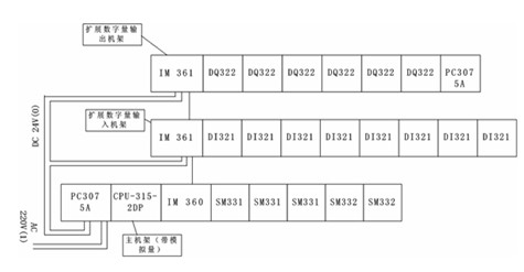 在電廠污水處理控制系統(tǒng)中,根據(jù)用戶要求及實(shí)際情況分析,我們采用西門子公司的S7-300系列產(chǎn)品來(lái)完成此項(xiàng)目。參照西門子公司提供的產(chǎn)品技術(shù)參數(shù),以S7-300系列中的CPU315-2DP實(shí)現(xiàn)控制功能,由于該系統(tǒng)模擬及數(shù)字輸入輸出量較多,采用接口模塊IM360、IM361(主機(jī)架使用IM360,擴(kuò)展機(jī)架使用IM361)連接擴(kuò)展的信號(hào)模塊滿足系統(tǒng)要求,其中信號(hào)模塊包括若干數(shù)字量輸入模塊 SM321,數(shù)字量輸出模塊 SM322,模擬量輸入模塊SM331,模擬量輸出模塊SM332。