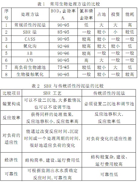 與傳統(tǒng)活性污泥法相比, SBR 工藝在裝置構成、 經濟性、 反應效率等方面有顯著的優(yōu)點, 見表 1、 表 2。