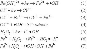 硫酸鐵、H2O2(30%)、結晶紫(CV)等均為AR級;20W紫外燈(上海仁和照明),400W金屬鹵燈(廣東歐陸照明),756P紫外可見分光光度計(上海光譜),COD消解器+DR-890比色計(美國HACH),868型pH計(美國ORION)。