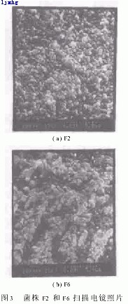 2)吸附架橋作用:發酵液中的蛋白質、多肽和多糖等物質均為半剛性長鏈大分子,投加到水中充分伸展,具有較大空間體積,對水中懸浮粒子具有吸附架橋作用.由掃描電鏡照片(圖2)可以清晰地觀察到,絮凝菌在發酵過程中分泌大量的黏液性物質,對水中懸浮顆粒具有一定的吸附作用.