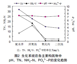 生化系統(tǒng)在各主要構(gòu)筑物中pH、TN、NH3-N、PO43--P的變化趨勢(shì)如圖2所示。