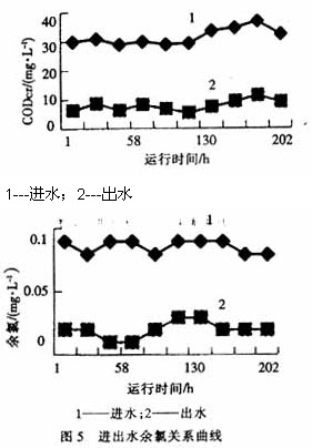 在不同的產(chǎn)水量、不同的運(yùn)行周期下測得超濾膜前后的CODCr和余氯的關(guān)系曲線,見圖4、圖5。