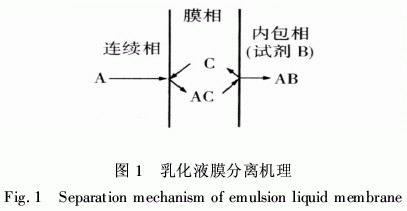 如圖1所示。待分離物質A不溶于膜相,故選擇特定的運輸載體C溶于膜相。物質A在連續相- 膜相界面與膜相載體C反應,發生可逆正向反應生 成中間產物AC,AC擴散至膜相另一側與內包相試 劑B反應,生成不溶于液膜的物質AB,并使C重新 還原釋放。通過流動載體和待分離物質之間的選擇性 可逆反應,極大地提高了物質A在液膜中的有效溶解度,增大了其膜內的濃度梯度,提高了傳質效率。