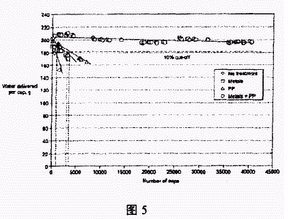 循環數約為1000時收集水樣用于無機物的分析。結果顯示釋放到水中的鋅離子(約為1.0mg/L),和銅離子的含量(約為0.05mg/L)在優選范圍內。使用聚磷酸鹽和金屬顆粒復配的水處理將配水器的性能提高了50倍以上。被傳輸水量保持高于目標量的90%,水溫穩定。