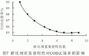 從圖7可以看出,廢水COD去除率隨著反應次數的增加逐漸下降,最后維持在85%左右。表明造紙廢水的可處理容量增加了,而所制備的催化劑仍然具有較高的催化活性和穩定性。