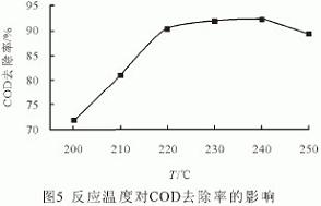 從圖5可以看出,隨著溫度的升高,廢水COD去 除率不斷提高。這是由于O2在水中的傳質系數隨溫度的升高而增大,同時溫度的升高還可以減小水的粘 度,并增加氧氣向液體中傳質速度[8]。由于加入Cu基催化劑后,降低了廢水中有機物的反應活化能,使有機物更容易被降解去除。雖然隨著溫度的升高處理效果愈來愈好,但溫度過高時,反應的動力消耗勢必增加。另一方面,從工程角度考慮,溫度越高,設備和投入的費用就越多。因此,結合各方面因素綜合考慮,認為在達到適當的去除效果前提下,盡量減少成本,則要選擇較低的反應溫度。因此,實驗確定適宜的反應溫度為220℃。
