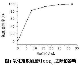 從上圖1可以看出,加入了氧化劑,CODCr的值反而增加了,并且隨著氧化劑用量的增加,CODCr值逐漸增加。這是因為NaClO使染料分子的偶氮鍵斷裂,原來的大分子變成小分子,有利于K2Cr2O7的氧化從而使CODCr增高;從上圖2可以看出,加入了氧化劑,色度的去除率即顯著提高,并且隨著氧化劑用量的增加,色度的去除率逐漸增加,但當氧化劑的量達24 mL以后時,色度的去除率基本不再增加。