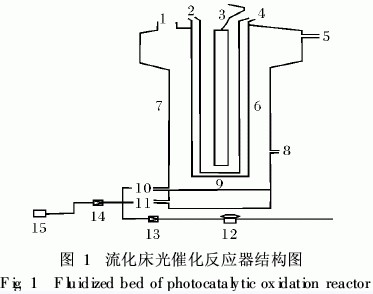 1.加料口,排氣口;2.冷凝水進口;3.高壓汞燈;4.冷凝水出口; 5.出水口;6.石英冷肼;7.反應瓶;8.取樣口;9.曝氣板;10.進水口; 11.進氣口;12.泵;13.液體流量計;14.氣體流量計;15.空壓機