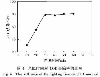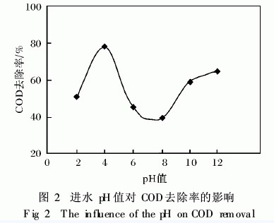 由圖2可知,進水pH在4時, COD去除率較 高,達到80%。這是由于在酸性條件下,一方面,帶 正電的催化劑表面有利于光生電子向催化劑表面的 遷移,與表面吸附的電子受體O2(ads)反應生成 O2-,抑制光生載流子的復合;另一方面,也有利于 體系中帶負電荷的有機分子向催化劑表面遷移和吸 附,使反應速率提高。在接近中性時, COD去除率 較低,因為顆粒大小、表面負荷、TiO2能帶位置都受 pH的強烈影響,且跟TiO2在純水中等電點在6左 右有關。