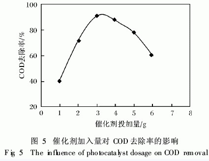由圖5可知,當催化劑的投加量2 g/500 mL 時,COD去除率較低;隨著催化劑用量增加,COD去除率逐漸增加,但當催化劑用量增加到大于3g/500 mL后,COD去除率則略有下降。這種現象表明,催化劑用量少時,有效光子不能完全轉化為化 學能,反應速率較低;通過適當增加催化劑的濃度能提高紫外光的利用率,形成更多的電子-空穴對, 增加了反應活性位數量,產生出更多的活性物 質[8],從而加快了降解速度。但當催化劑濃度增加到一定程度后,光子能量已得到了充分的利用,繼續 增加催化劑濃度,只會引起溶液渾濁度增加,影響光的透過率,導致光子效率降低,降低反應速度。本實驗催化劑最佳投加量為3. 0 g/500 mL。同時可以查看中國污水處理工程網更多技術文檔。