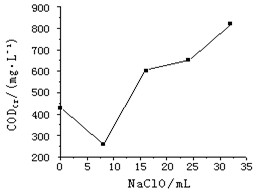 從上圖1可以看出,加入了氧化劑,CODCr的值反而增加了,并且隨著氧化劑用量的增加,CODCr值逐漸增加。這是因為NaClO使染料分子的偶鍵斷裂,原來的大分子變成小分子,有利于K2Cr2O7的氧化從而使CODCr增高;從上圖2可以看出,加入了氧化劑,色度的去除率即顯著提高,并且隨著氧化劑用量的增加,色度的去除率逐漸增加,但當氧化劑的量達24mL以后時,色度的去除率基本不再增加。