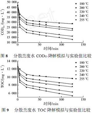 由表4動(dòng)力學(xué)參數(shù)預(yù)測CODCr和TOC降解情況(見圖8、9,圖中符號(hào)為實(shí)驗(yàn)數(shù)據(jù),線為模型預(yù)測),CODCr和TOC預(yù)測值與實(shí)驗(yàn)值相當(dāng)吻合,CODCr和TOC去除率最大偏差分別為2.00%和1.80%,說明該模型解釋分散蘭廢水的濕式氧化宏觀過程是合理的。同時(shí)可以查看中國污水處理工程網(wǎng)更多技術(shù)文檔。