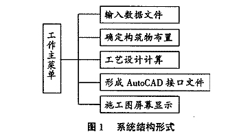 本系統(tǒng)分3個模塊。工藝流程模塊和設(shè)計計算模塊用 Visual Basic語言實現(xiàn),繪圖模塊以R14為開發(fā)平臺,充分利用了AutoCAD的二次開發(fā)功能。