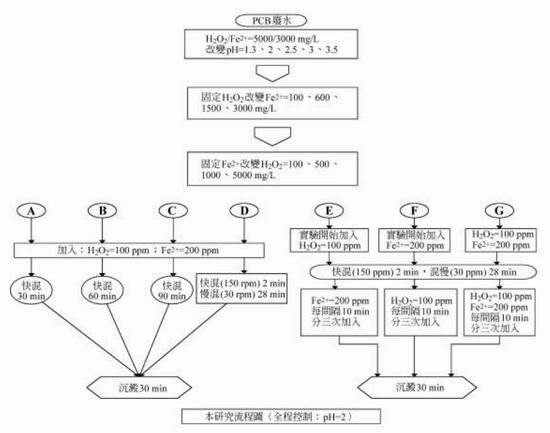 印刷電路版(Printed Circuit Board,PCB)主要由銅箔、油墨、乾膜、硫酸、氫氧化鈉、純錫六種主要原料合成,其中含有高濃度的金屬離子及有機污染物質,若未妥善處理,常會造成放流水COD過高,對環境造成極為嚴重的污染。Fenton程序為高級氧化處理程序之一,原理系以H2O2與Fe2+在酸性條件下,產生氫氧自由基,氧化廢水中有機物質,以及亞鐵離子所具有之混凝沉淀效應來去除廢水中之懸浮固體,以達到COD去除效果。在文獻中得知(羅,1994)(1)若在強酸性條件下將H2O2加入含有機物及Fe2+廢水溶液中,Fenton試劑結合過渡金屬和過氧化氫反應產生過氧羥自由基(.HOO)及羥自由基(.HO),則將產生復雜的氧化還原反應。而對于廢水中的金屬離子,可使用中和沉降法、離子交換法、重金屬捕集劑等方式處理。但多半採取化學混凝沉淀方式,亦即使產生氫氧化物的沉淀,將其去除。