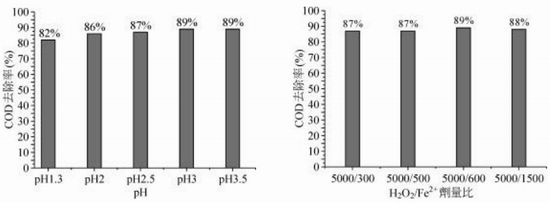 一、最適pH及H2O2/Fe2+劑量比初步設定H2O2/Fe2+劑量比為5000  mg/l /3000 mg/l,改變初始pH為1.3、2、2.5、3及3.5,探討在固定H2O2/Fe2+劑量下,pH對于COD去除之影響,其結果由圖2所示,得知pH值不論是1.3、2、2.5、3及3.5時,去除率皆為80%以上,其不同pH控制下去除率并無明顯差別,且實場廢水pH值原為2,故為了配合廠商經濟成本需求,不需再調整pH值,故選pH=2為本研究之控制參數,并進一步尋求H2O2/Fe2+最適劑量比。