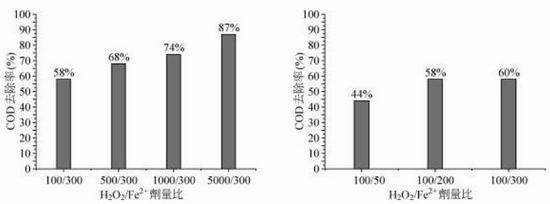 圖4  固定Fe2+劑量(300 mg/l)改變H2O2劑量對COD去除的影響