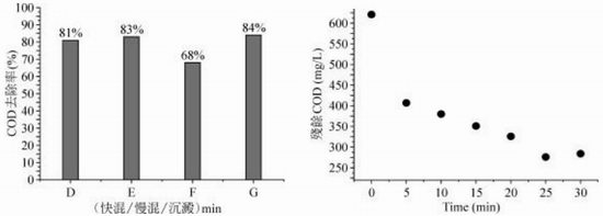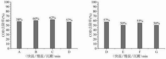 注:A為快混30 min沉淀30 min、B為快混60 min沉淀30 min、C為快混90 min沉淀30 min、D為快混2 min慢混28 min沉淀30 min。D為全部加入H2O2  / Fe2+藥劑量、E為H2O2全加,Fe2+每隔10 min三次加入、F為Fe2+全加,H2O2每隔10min分三次加入、G為H2O2 /  Fe2+每隔10 min分三次同時加入。