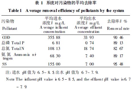 表1 列出了系統運行6 個多月的污染物平均濃度和去除率。由表1可以看出, 系統對COD、總磷、總、氨等污染物質均有良好的去除效果, 處理出水達到國家環境保護總局頒發的《城鎮污水處理廠污染物排放標準》( GB18918 2002)一級B標準。