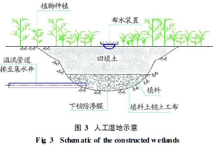 人工濕地深度處理單元構造由進水區、處理區、出水區三部分組成, 并且底部做好防滲層 (圖3)。