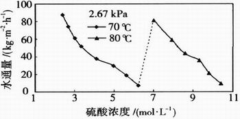 首先用稀的純硫酸進行試驗.結果表明,采用 VMD工藝可將2.1 mol/L(18.3%)的硫酸濃縮到 10.32 mol/L(65.5%),如圖3所示.開始控制熱側 溫度為70℃,冷側為2.67 kPa的低真空,當濃縮到 硫酸為6.23 mol/L(55.1%)時,水的通量已很小, 為此將熱側溫度提高至80℃,以增大傳質推動力, 此時可使硫酸進一步濃縮至65.5%.但是用廢酸直 接濃縮時發現隨硫酸濃度增加,由于鹽析效應, FeSO4結晶析出,這一結晶使膜發生“濕化”現象,喪 失疏水性.深入研究發現,廢酸中的鈦對膜蒸餾并無 影響,因此研究了先用擴散滲析法分離硫酸,但由于 鹽的泄漏,盡滲析產酸可以用VMD濃縮至65%, 但仍有亞鐵結晶析出的問題,為此又研究了三異辛 胺萃取硫酸的辦法,反萃得到酸濃度為1.12 mol/ L,酸回收率達91.4%.將反萃回收的酸在熱側80 ℃,冷側5.64 kPa條件下濃縮可得到10.30 mol/L (65.1%)的濃硫酸.
