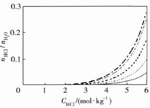 因為鹽酸有共沸點,按常規理解似乎不可能回 收濃的鹽酸,但考慮到RECl3的鹽析效應,首先從 理論上計算了含SmCl3的鹽酸體系中水及HCl的 分壓,發現相對于純鹽酸溶液而言,同條件下,由于 SmCl3存在,導致溶液體系H2O分壓減小,而HCl 分壓增大,而且隨SmCl3濃度增大,H2O分壓的減 小及HCl分壓增大趨勢更為明顯.圖4為根據計算 結果作出的氣液平衡關系圖.