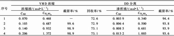 集成膜法回收硫酸稀土溶液中硫酸,系指先采用減壓膜蒸餾濃縮低濃度的硫酸稀土溶液,再采用擴散滲析法處理濃縮液以回收其中硫酸,其中擴散滲析的料液為減壓膜蒸餾濃縮硫酸稀土溶液的濃縮液.由于擴散滲析處理的是濃縮液,較之單獨采用擴散滲析法回收硫酸稀土溶液中的硫酸,處理量大大減小,設備的一次性投資因此降低,而且回收得到的硫酸濃度增大.表為經減壓膜蒸餾濃縮不同程度 的硫酸稀土溶液,再經擴散滲析的實驗結果.實驗固定條件,料液成分:CRE=0.070 mol/L,CH2SO4= 0·468 mol/L,減壓膜蒸餾濃縮時,溫度60℃,料液流速5.8 cm/s,減壓側壓力12.7 kPa;擴散滲析操作方式為一次通過式,料液流量150 mL/h左右,流量比1.0左右,溫度28~29℃,滲析料液為減壓膜蒸餾濃縮過程所得的濃縮液.