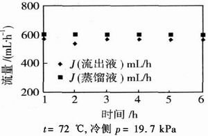 以預濃縮至堿濃度為244 g/L的2 L溶液循環 液置于槽2中.堿濃度為122 g/L的料液連續從11 號高位槽進入2號槽,從2號槽上部溢流口相應連 續流出濃縮液至13號計量槽.8號槽收集冷側之蒸 餾液.圖2為循環槽溢流流出液及蒸餾液流量隨時 間的變化關系.