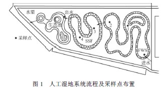 濕地系統總面積約1 000 m2 , 其中:①自由表面流型(FWS)人工濕地450 m2 , 水深為30~ 100 cm, 水流徑道的孔隙率約為0. 8, 濕地中種植蘆葦、莎草、香蒲、水芙蓉等水生植物。②潛流型( SSF) 人工濕地186 m2 , 水深約為100 cm, 填充的濾材包括礫石、牡蠣殼兩種, 孔隙率為0. 45, 系統中種植香蒲、荸薺、培地茅等水生植物。③生態景觀池146 m2 , 其功能一方面能夠持續吸收水中的營養鹽, 另一方面可以水生植物作為生物指標, 觀察其生長狀況以了解水質凈化的情況。同時也可作為園區景觀規劃的一部分。池中以水生植物為主體, 這些水生植物除了具有觀賞的功能外, 還兼具持續吸收水中營養鹽及提供各類生物棲息場地的功能。④步道與花木200 m2 , 基地剩余部分規劃為系統維護理空間, 亦可整理成為參觀休憩的園區。場地周圍有斷面尺寸寬×深= 1 m× 0. 7 m 污水處理廠出水水渠, 人工濕地系統流程及采樣點布置見圖1。