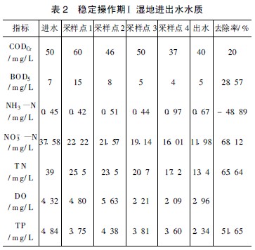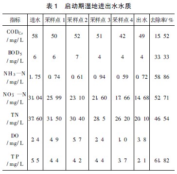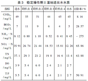 于2007 年7 月將流量控制為100 m3 / d, 水力負荷為0. 16 m/ d。表3 為6 個月后各項水質平均值, 此期間濕地已經完全穩定運行。