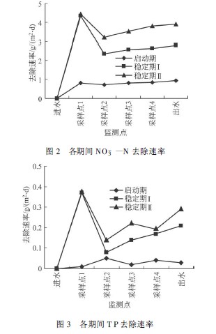 比較啟動期與穩定操作期Ⅰ、Ⅱ, 人工濕地對于 NO- 3-N、T P 的去除速率如圖2、圖3 所示。穩定操作期的人工濕地中各點去除速率均比啟動期高, 另外值得注意的是在穩定操作期, 采樣點①的 NO- 3-N 去除速率遠高于其他各采樣點, 主要原因為濕地入流段底泥中的硝化菌受高濃度N O- 3-N 刺激, 硝化活性遠高于濕地中其他各點, 使濕地入流段的N O- 3-N 去除比其他各點優越; 反之, 在濕地啟動適應期階段并無類似的情形發生, 顯示濕地底泥中的硝化菌同樣處于適應期。采樣點①總磷的去除速率也高于其他各采樣點, 主要原因是該處放置了水芙蓉等浮水性植物, 在經常打撈的情況下, 水芙蓉可持續增長并攝取水中的磷[ 3, 4] 。