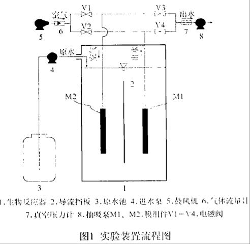 在該分離/ 曝氣微孔膜- 生物反應器中,兩組膜件以一定的運行周期交替充當過濾分離器和曝氣器。如圖1 所示,在第一周期內,電磁閥V1、V4 開啟,V2、V3 關閉,膜組件M1 與出水管相通,充當過濾分離器;膜組件M2 與進氣管相通,充當曝氣器,生物反應器內的活性污泥混合液被強制循環,在導流擋板的左側形成上升流,而在右側形成下降流。在第二周期內,電磁閥V1、V4 關閉,V2、V3 開啟,膜組件M2 與出水管相通,充當過濾分離器;膜組件M1 與進氣管相通,充當曝氣器,此時,在導流擋板的右側形成上升流,而在左側則形成下降流。在任一運行時刻,整個系統均處于好氧狀態,并且連續出水。試驗原水取自某學生宿舍樓的生活污水,活性污泥取自北京市北小河污水處理廠二沉池回流污泥。每一次試驗結束后,均采用次氯酸鈉溶液(活性氯含量約為萬分之一) 對膜組件進行化學清洗(浸泡時間約為12 小時) ,以清除膜污染,恢復并測其清水膜通量到試驗前的水平,如此方進行下一次試驗。
