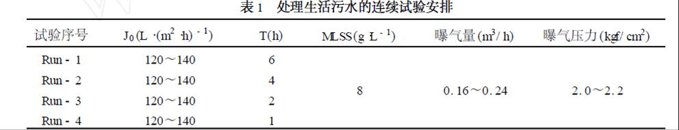 利用圖1 所示的裝置并采取如1. 2 所述的方法進行了分離/ 曝氣微孔膜- 生物反應器處理生活污水的連續試驗,以考察分離/ 曝氣交替運行對膜過濾性能的影響,具體的試驗條件如表1 所示,其中T 為分離/ 曝氣交替運行周期(h) 。