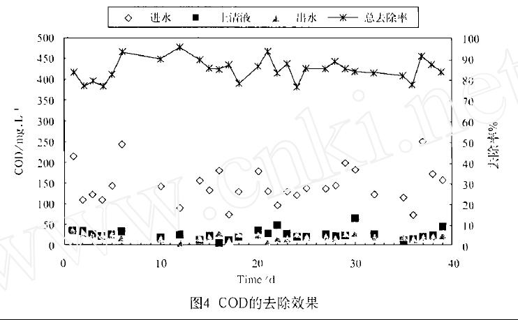 1) COD 去除效果:圖4 顯示的是在整個連續試驗中進水、上清液和PE - 4 膜組件出水的COD 以及整個系統對COD 的總去除率的變化情況。從進水COD 的變化來看,試驗用原水屬低強度的生活污水,COD平均值為146mg/ L 。上清液COD 較之進水有大幅下降,平均值為29mg/ L ,表明試驗階段活性污泥具有很高的生物降解性能。出水COD 相比上清液又有所下降,平均值為21mg/ L ,最大值為35. 8mg/ L ,表明微孔管不但可以有效截留污泥顆粒及微生物,并且可以進一步強化生物反應器的COD 去除效果。整個系統對COD 的總去除率平均超過85 %。