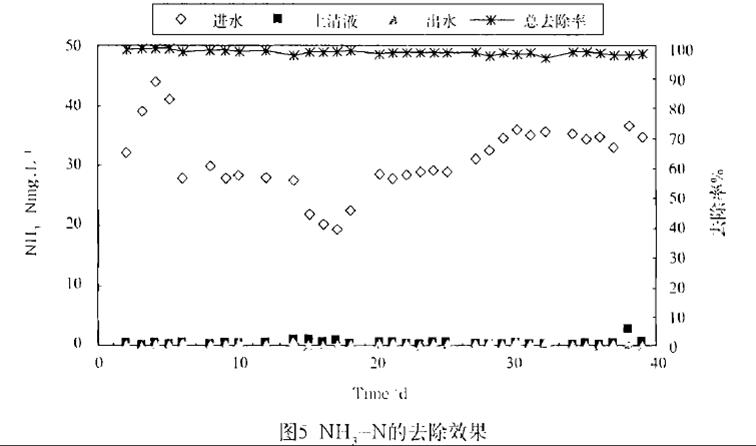 2) 氨氮去除效果:圖5 顯示的是在整個連續試驗中進水、上清液和PE - 4 膜組件出水的NH3 - N 以及整個系統對NH3 - N 的總去除率的變化情況。進水NH3 - N 在20~45mg/ L 之間,平均為32mg/ L。上清液NH3 - N 大多小于1mg/ L ,出水NH3 - N 始終未超過1mg/ L ,二者的平均值分別為0. 81mg/ L 和0. 53mg/ L ,表明試驗階段活性污泥具有很高的硝化能力。整個系統對NH3 - N 的總去除率平均超過98 %,同時可以查看中國污水處理工程網更多關于分離/ 曝氣微孔膜- 生物反應器處理廢水的技術文檔。