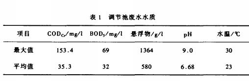 廢水主要由生產廢水、洗煤水、生活污水三部分組成。生產廢水主要來源于化學水處理系統中的再生、反洗排水,含鹽量高達4000mg/L;洗煤水主要污染物是灰粉和煤屑,懸浮物含量較高;生活污水主要來源于廠區的衛生設施、食堂等服務設施用水和家屬區的日常生活污水,有機物含量較高。廢水匯合后,進入調節池,起到調節水質緩沖作用。調節池廢水水質見表1。