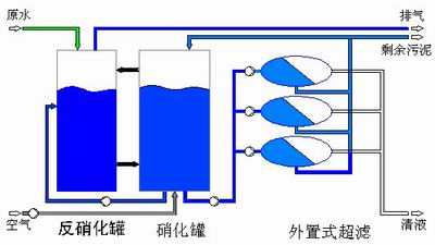 外置式膜生物反應器是將生物處理和膜分離技術有機結合的一種新型滲濾液處理工藝,MBR中的膜分離技術代替了傳統的泥水分離技術(如二沉池),實現了水力停留時間和污泥泥齡的完全分離,通過膜分離的污泥回流,可以使反應器保持很高的污泥濃度(15-30g/l),滲濾液中難降解的污染物也能有效的降解;同時采用高效深水射流曝氣,氧的利用率大幅度提高。