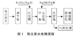 常用破絡的化學藥劑有Fe鹽、Na2S等,因為S2-屬于排放標準中嚴格控制的污染物,因此Na2S只能作為輔助的破絡劑,嚴格控制其投加量。常用絡合廢水處理工藝見圖1。