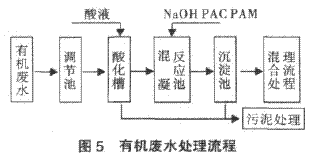 在酸性條件下,廢水中的感光膜、清洗劑會析出,形成濃膠狀聚合物,經固液分離去除,再把pH調至弱堿性,加入混凝劑,經沉淀進一步降低廢水的COD值。