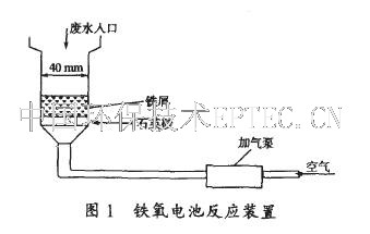 鐵屑法是利用金屬腐蝕原理, 形成原電池對廢水進行處理的工藝, 我國從20 世紀(jì)80年代就(就字為避免系統(tǒng)攔截所加,原文沒有)開始這一領(lǐng)域的研究〔2 〕, 已有不少文獻報道。特別是近年來, 進展較快, 在印染廢水、電鍍廢水、制藥廢水、石油化工廢水、含砷及含氰廢水治理方面相繼有研究報道, 有的已投入實際運行。一般的鐵屑法是將廢鑄鐵屑與惰性電極放在一起, 形成鐵- 惰性電極原電池, 通過鐵屑腐蝕發(fā)生的一系列化學(xué)反應(yīng)來達到處理廢水的目的, 也叫內(nèi)電解法或者腐蝕電池法, 一般由活性炭〔3〕、煙道灰〔4〕、瓦斯灰〔5〕作為惰性電極。該方法存在處理速度慢, 活性炭、煙道灰和瓦斯灰難于與水分離, 鐵屑容易板結(jié)等不足, 阻礙了其工程規(guī)模應(yīng)用的進度。為了解決上述鐵屑法的不足, 筆者首次嘗試提出了鐵- 氧電池法, 即將廢鑄鐵屑放入盛有抗生素廢水的反應(yīng)器中, 從反應(yīng)器下端用空氣泵鼓入空氣, 其中的氧氣與鐵屑形成了Fe - O 腐蝕電池,從而加速鐵的腐蝕速度, 以求在常規(guī)條件下滿足抗生素廢水 處理的要求。