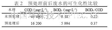 在鐵屑質(zhì)量為100 g、曝氣時間50 min、廢水體積為60 mL 的條件下用鐵- 氧電池進行預(yù)處理, 結(jié)果表明可生化性(BOD5 /COD) 由難生化( 0.22) 提高至可生化( 0.37) , 廢水可生化性得到了較明顯的改善( 見表2) 。
