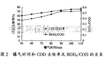 由圖2可知, 曝氣時間越長COD 去除率越大,BOD5 /COD 提高越顯著, 曝氣時間為90 min 時,COD 去除率為73%, BOD5 /COD 達到了0.53, 當(dāng)曝氣時間> 90 min 時, 其增長速率變緩, 考慮到實際運行時, 處理時間越短越好,因此預(yù)處理時間選用90 min。