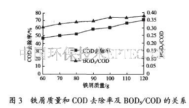 2.2.3 鐵屑質(zhì)量對COD 去除率和可生化性的影響在處理時間為50 min 和廢水體積為60 mL 的條件下, 改變鐵屑質(zhì)量對廢水進行預(yù)處理, 結(jié)果見圖3。
