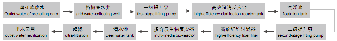 針對此類水水質特點并結合我公司多年來從事水處理工程的設計、運行管理經驗,我公司認為尾礦庫出水中COD濃度的60%~70%都來源于懸浮顆粒物及膠體類物質等,為了確保出水水質,去除尾礦庫出水中懸浮物是非常必要的。尾礦庫廢水處理工藝的關鍵點為:通過可靠、穩定的物化主體處理工藝去除污水中的懸浮物,同時可有效降低COD的含量。再輔以生化深度處理工藝去除未被降解的有機物,確保出水達標,同時為污水的回用創造良好的水質條件。