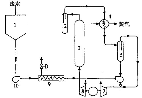 其工藝過程為:廢水通過貯存罐由高壓泵打入熱交換器,與反應后的高溫氧化液體換熱,使溫度上升到接近于反應溫度后進入反應器。反應所需的氧由壓縮機打入反應器。在反應器內,廢水中的有機物與氧發生放熱反應。在較高溫度下將廢水中的有機物氧化成二氧化碳和水,或低級有機酸等中間產物。反應后氣液混合物經分離器分離,液相經熱交換器預熱進料,回收熱能。高溫高壓的尾氣首先通過再沸器(如廢熱鍋爐)產生蒸汽或經熱交換器預熱鍋爐進水。其冷凝水由第二分離器分離后通過循環泵再打入反應器,分離后的高壓尾氣送入透平機產生機械能或電能。因此,這一典型的工業化催化濕式氧化系統不但處理了廢水,而且對能量逐級利用,減少了有效能量的損失,維持并補充催化濕式氧化系統本身所需的能量。
