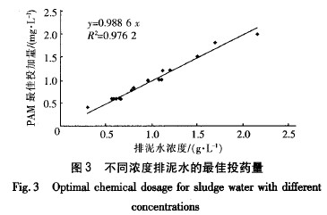 該水廠排泥水處理系統(tǒng)選用陰離子型聚丙烯酰胺(PAM)作為助凝劑,從生產(chǎn)實(shí)際來(lái)看,PAM投量不當(dāng)對(duì)系統(tǒng)的處理效果影響較大。PAM投加量不足時(shí),會(huì)導(dǎo)致反應(yīng)區(qū)絮體細(xì)小,沉降性能下降,容易引起污泥上;而過(guò)量投加PAM會(huì)造成污泥濃縮性能變差和浪費(fèi)藥劑等問(wèn)題。筆者通過(guò)中試研究了排泥水濃度與PAM最佳投藥量的關(guān)系,結(jié)果如圖3所示。由圖3可以看出,該水廠單位濃度排泥水(g/L) 的PAM最佳投藥量為1.0 mg/L左右。