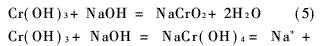 三價(jià)鉻形成Cr(OH)3的pH值下限為5.6。但其為兩性氫氧化物,當(dāng)pH值≥12時(shí)開(kāi)始復(fù)溶,至15時(shí)完全溶解。復(fù)溶生成亞鉻酸鹽或生成配合物: